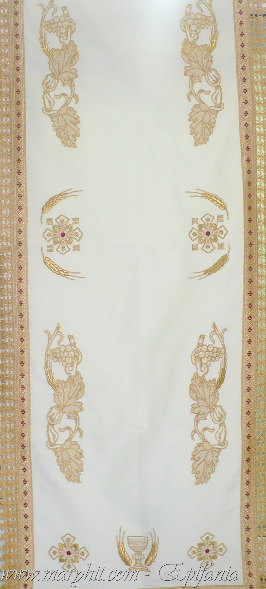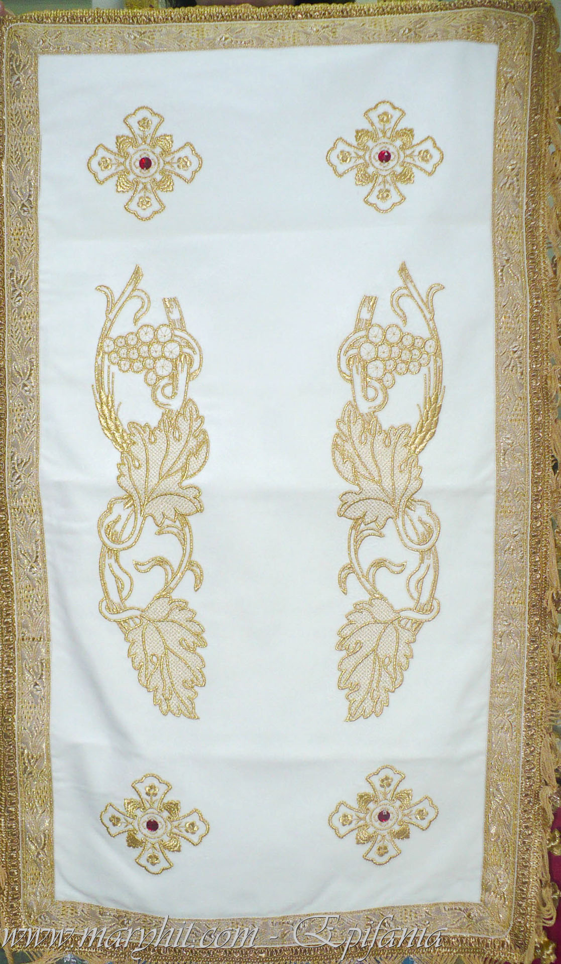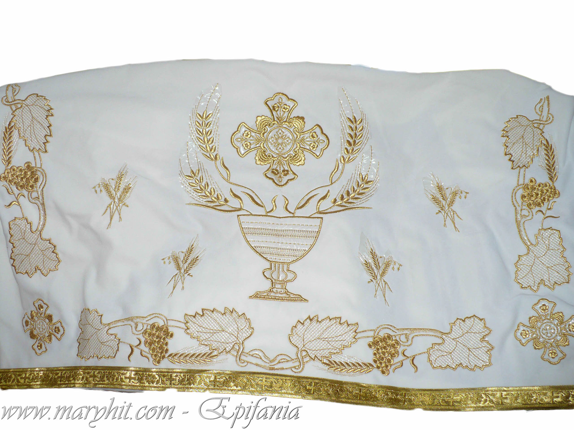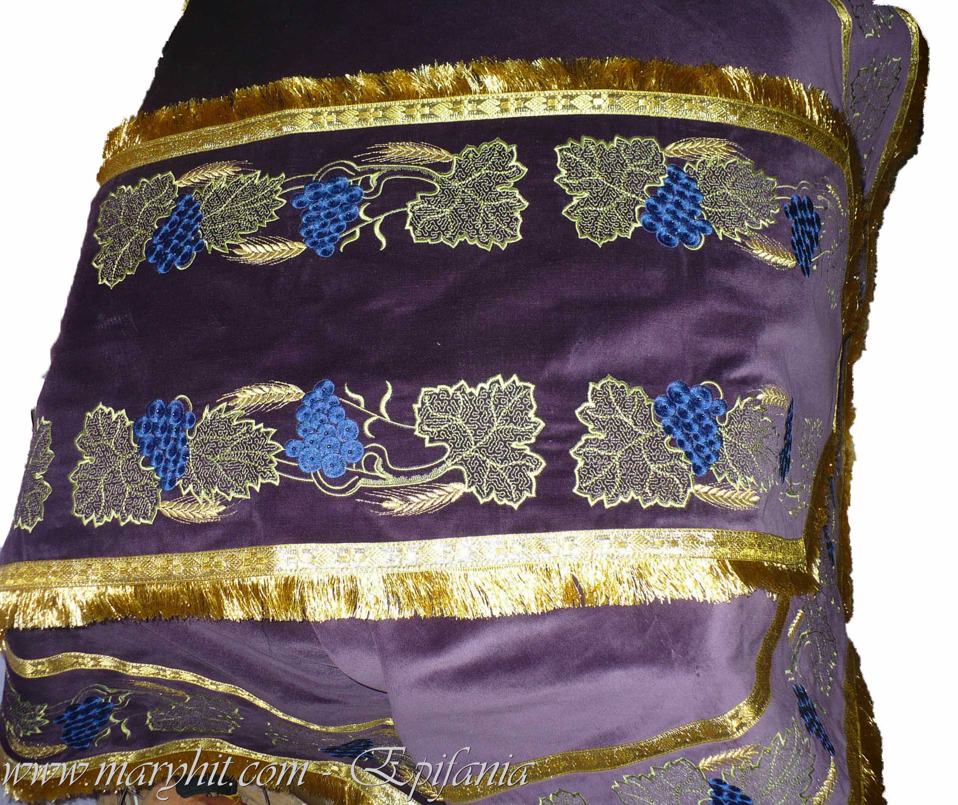 IB001 - Fata de masa Sf Altar din catifea alba brodata cu model struguri si spice.