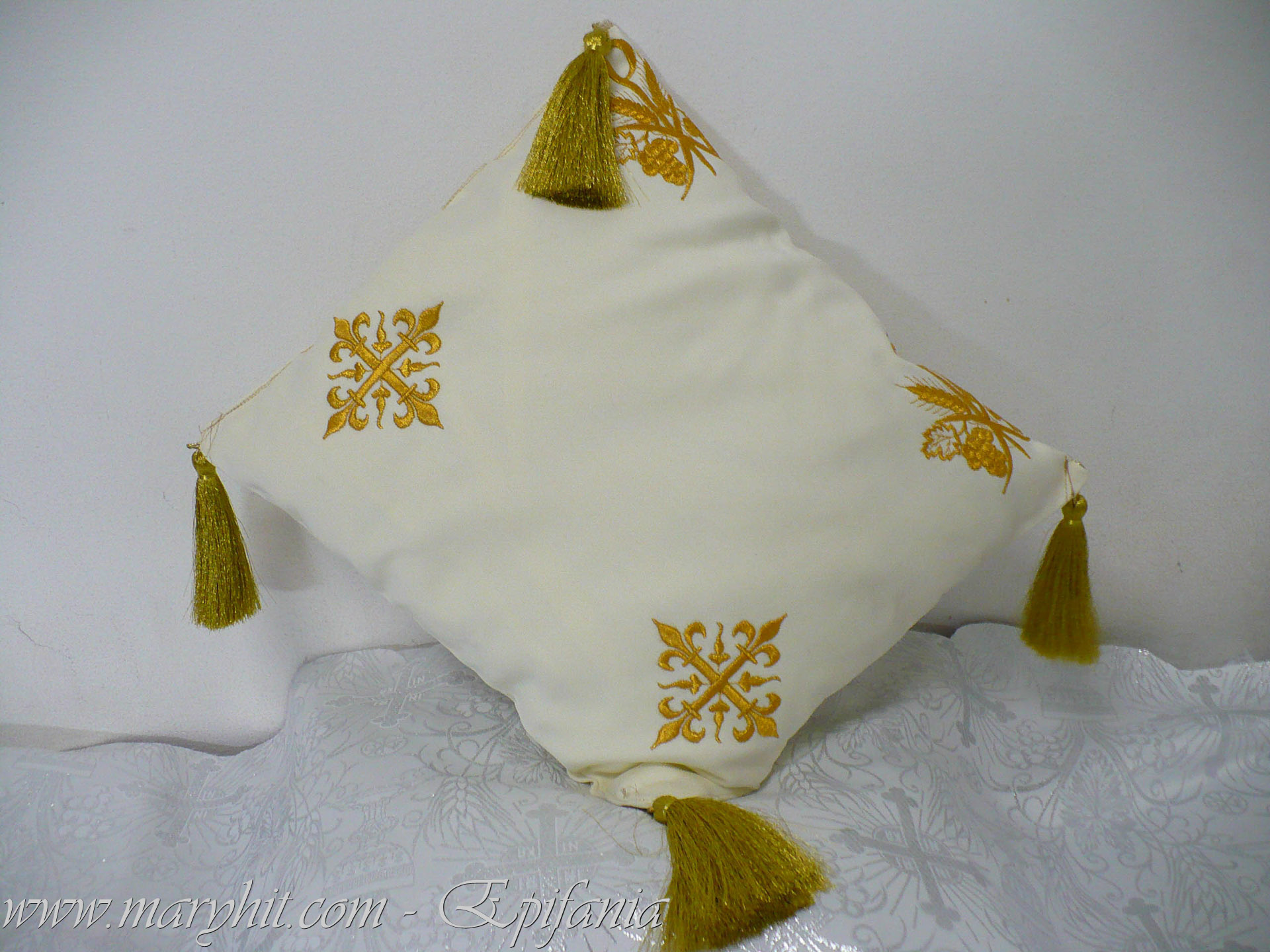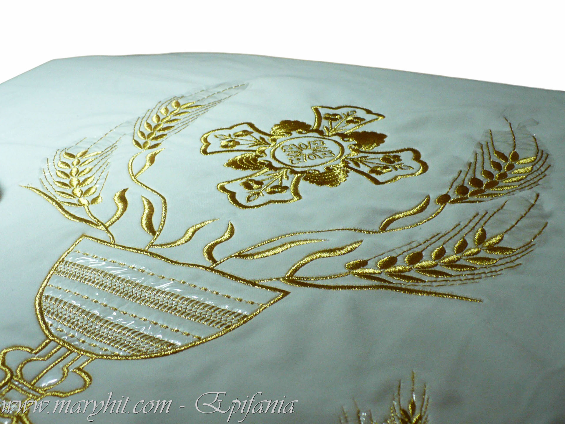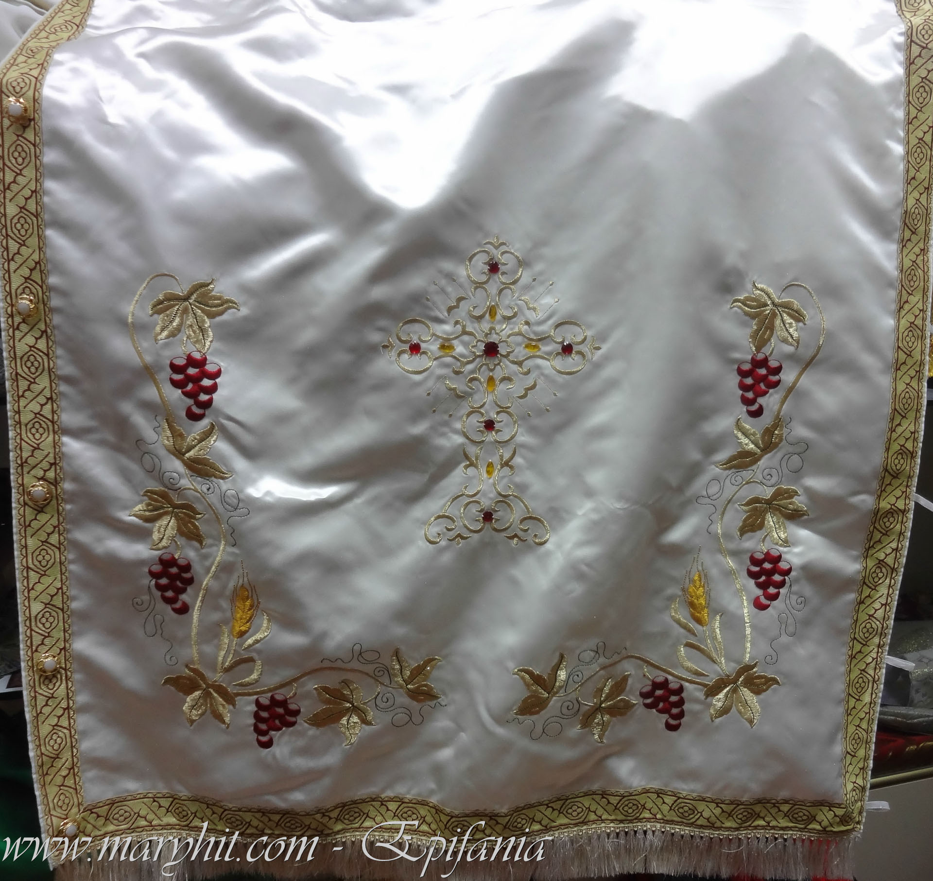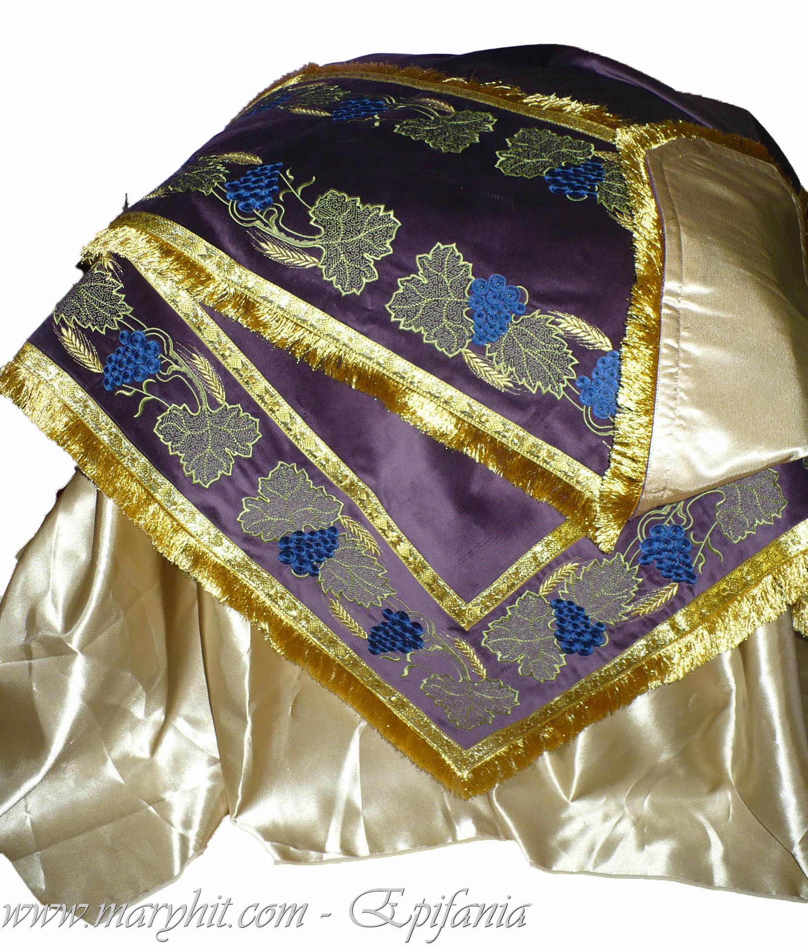 IB001 - Fata de masa Sf Altar din catifea alba brodata cu model struguri si spice.