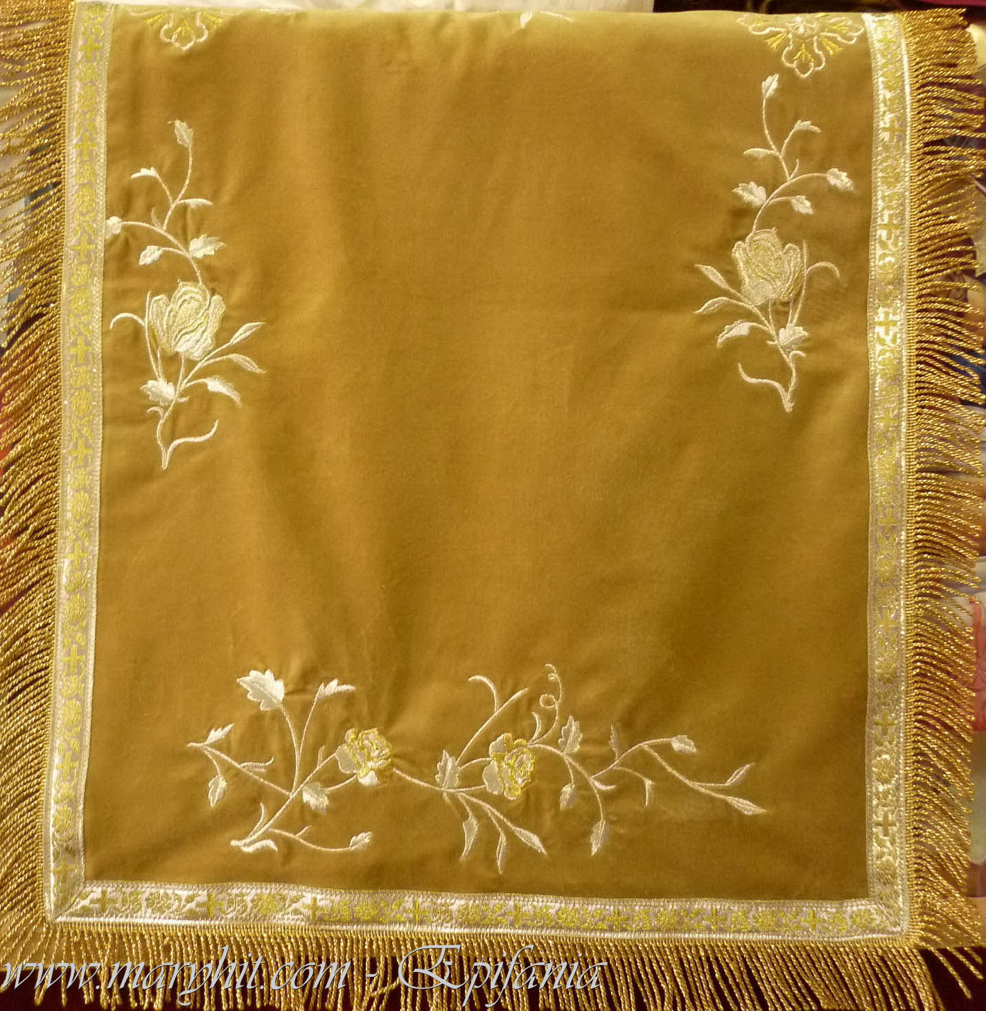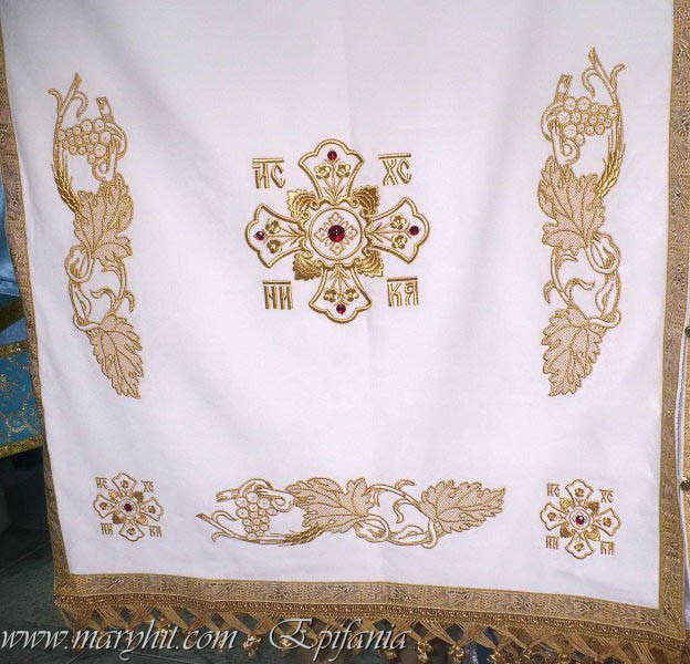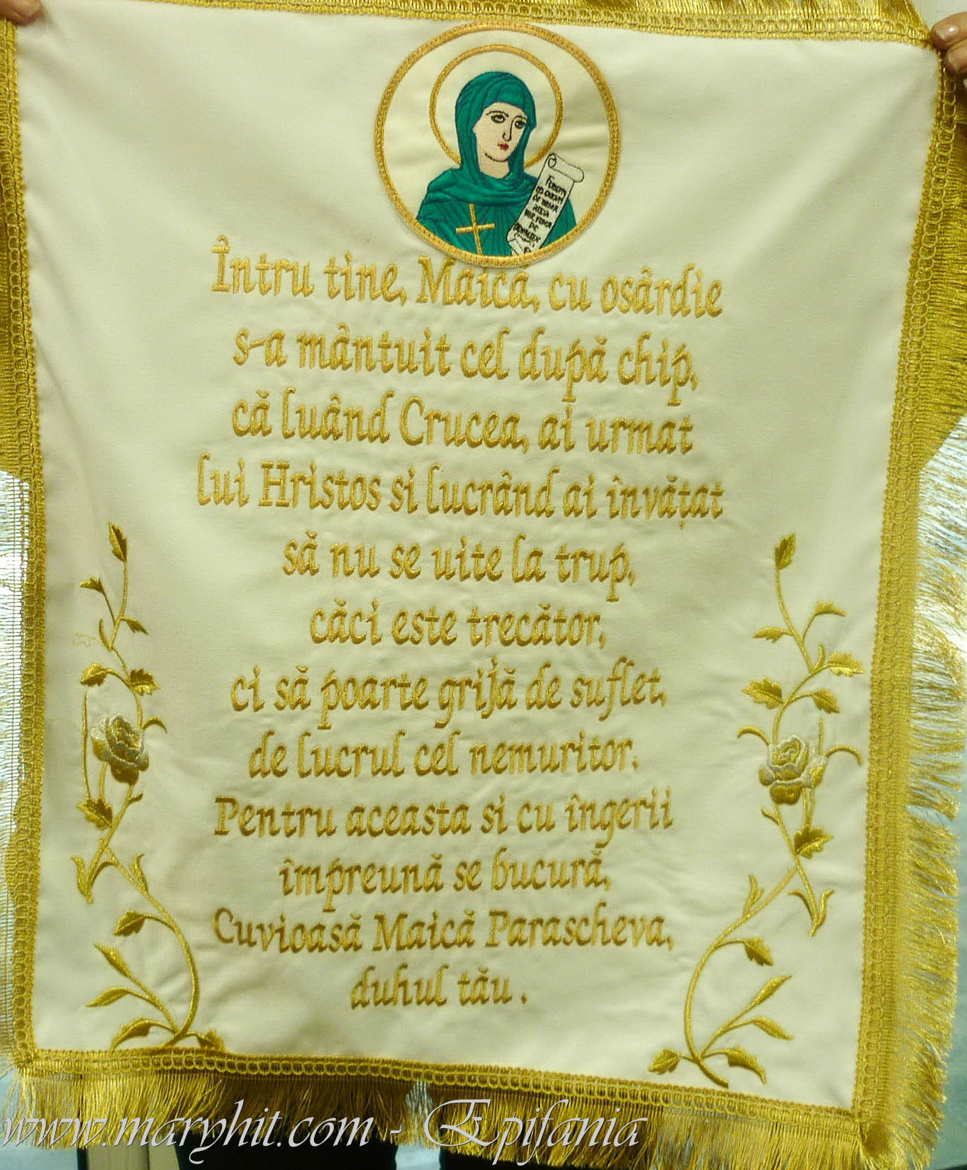 IB029 - Servet din catifea alba brodat cu icoana Maicii Domnului si tropar.