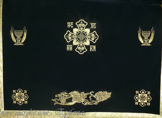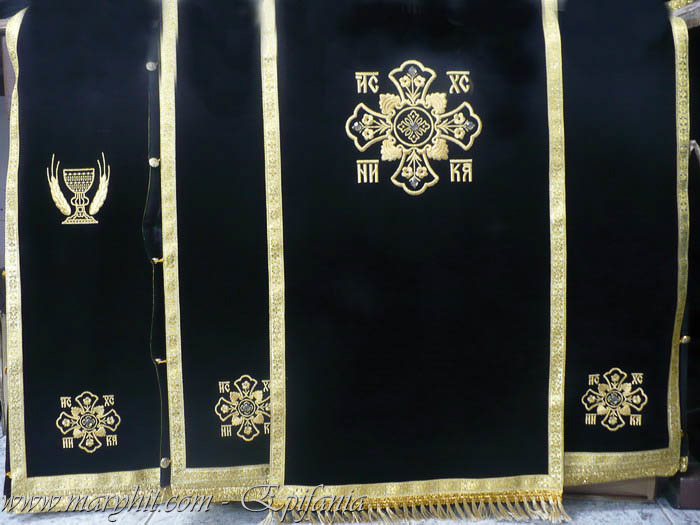 IB004 - Imbracaminte Biserica din catifea neagra brodata cu model struguri si cruci, specific pentru perioada postului.