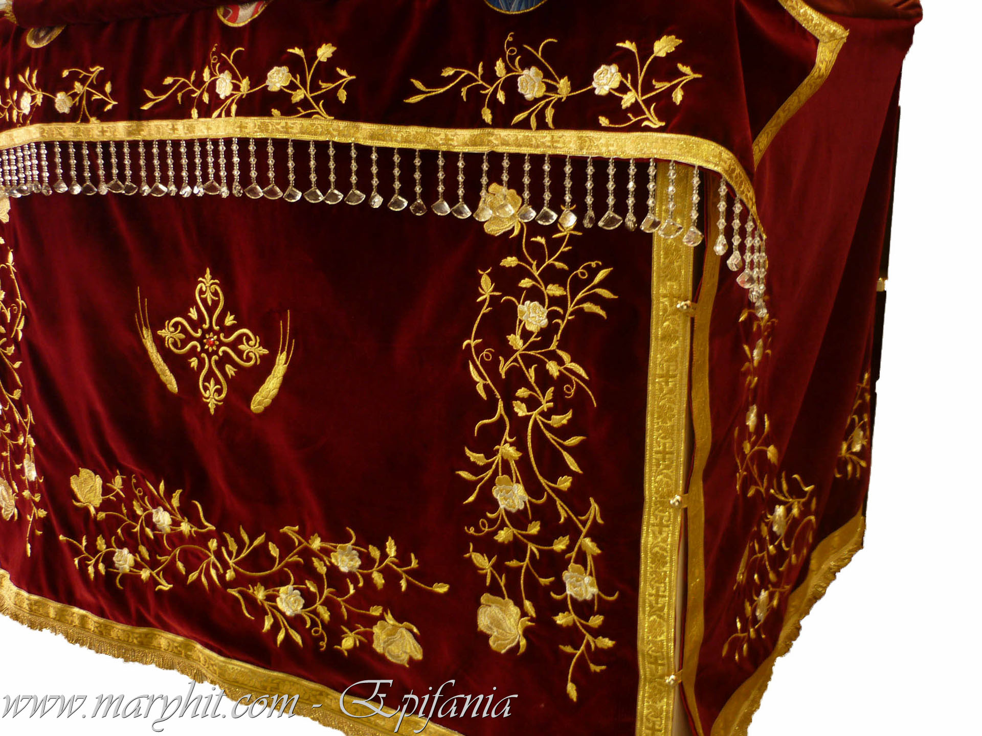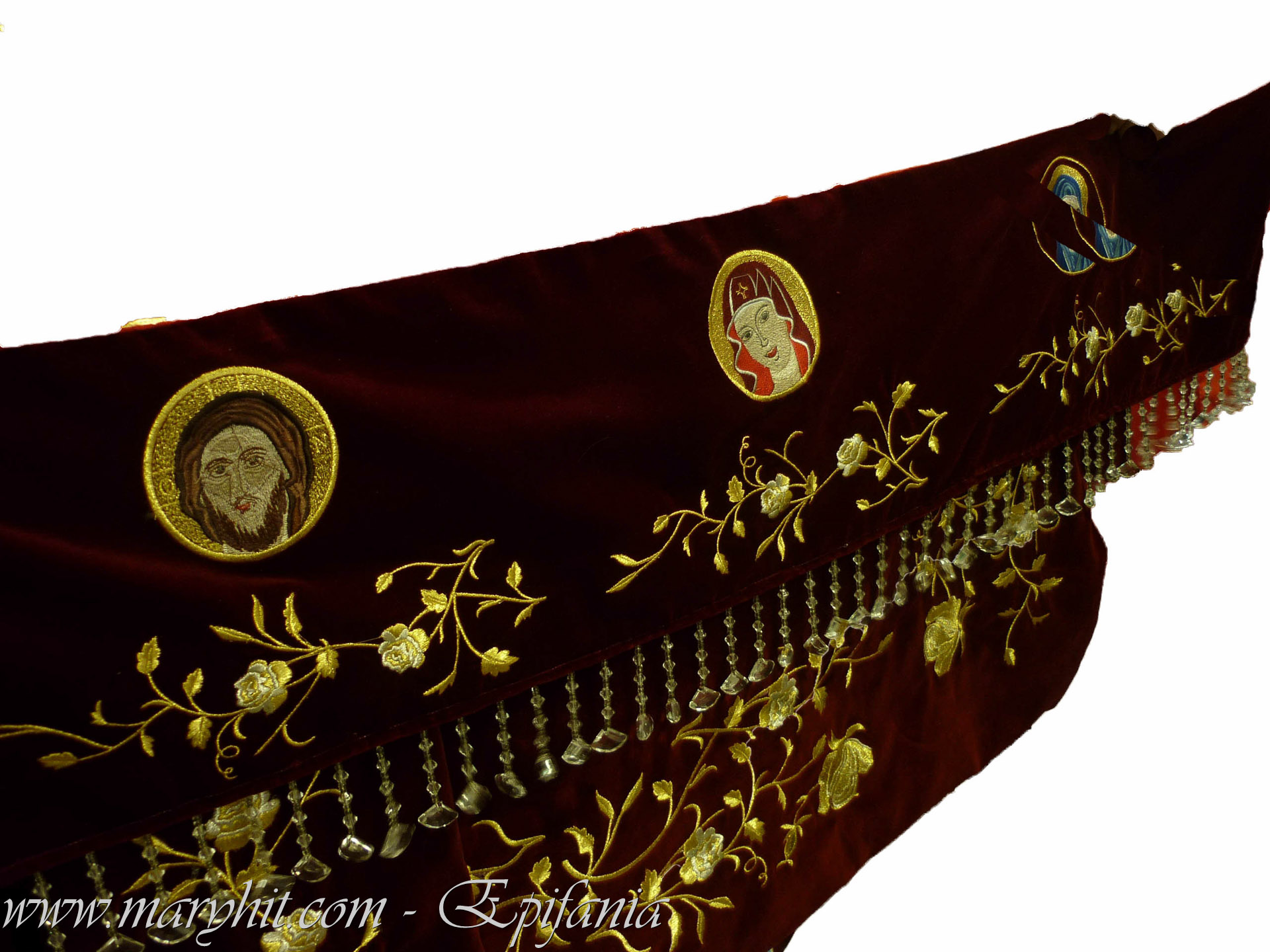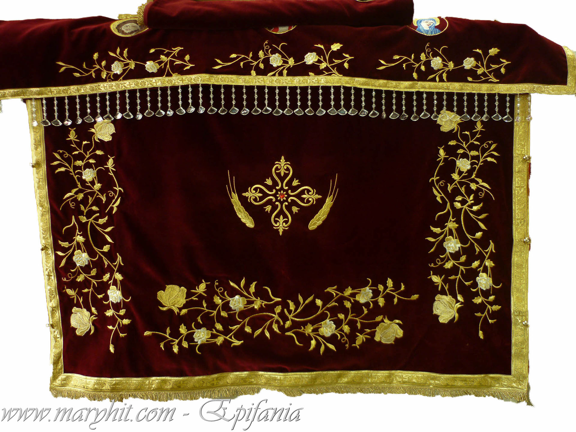 IB006 - Acoperamant Icoana din catifea grena cu broderie trandafiri si icoane.