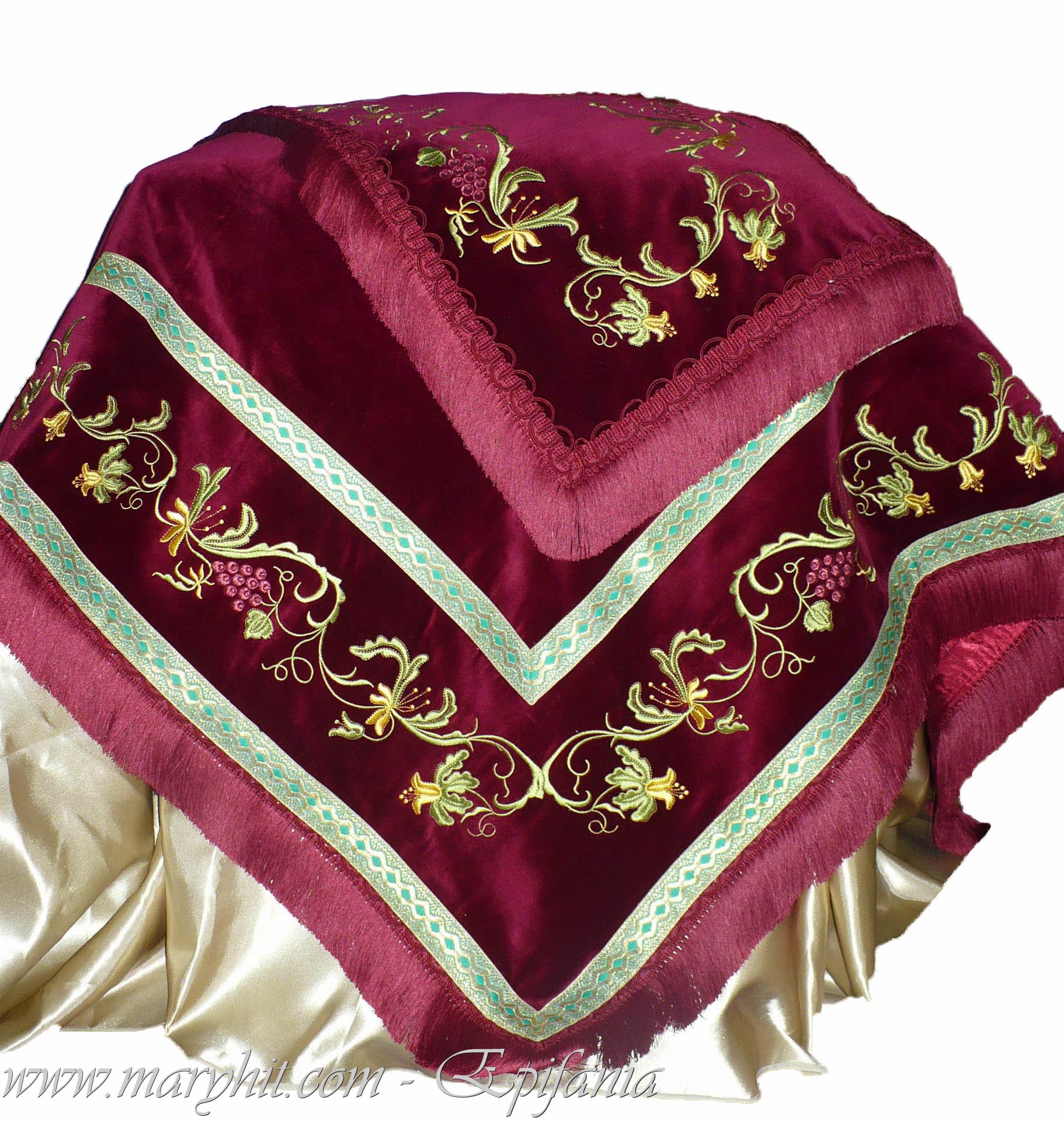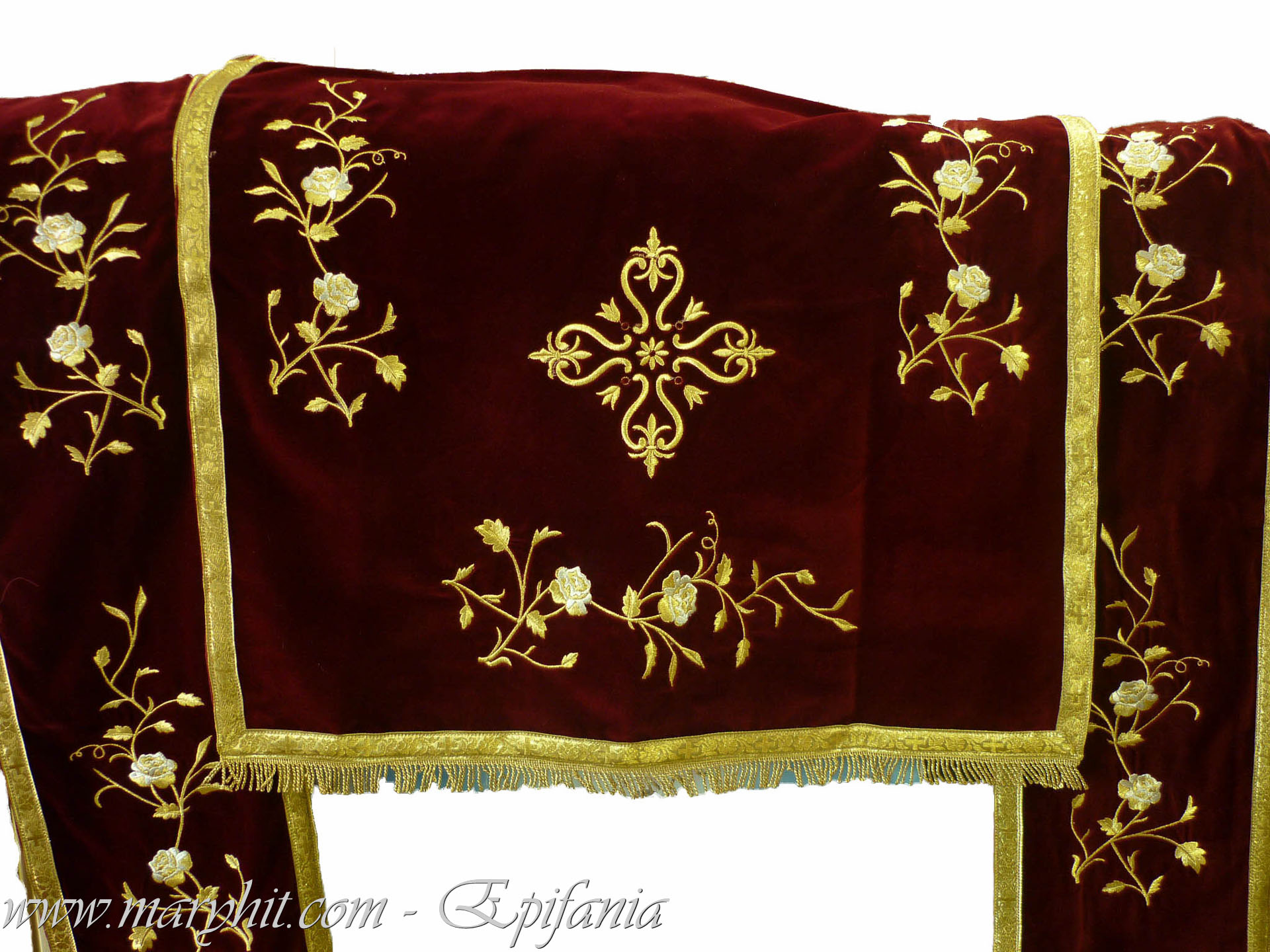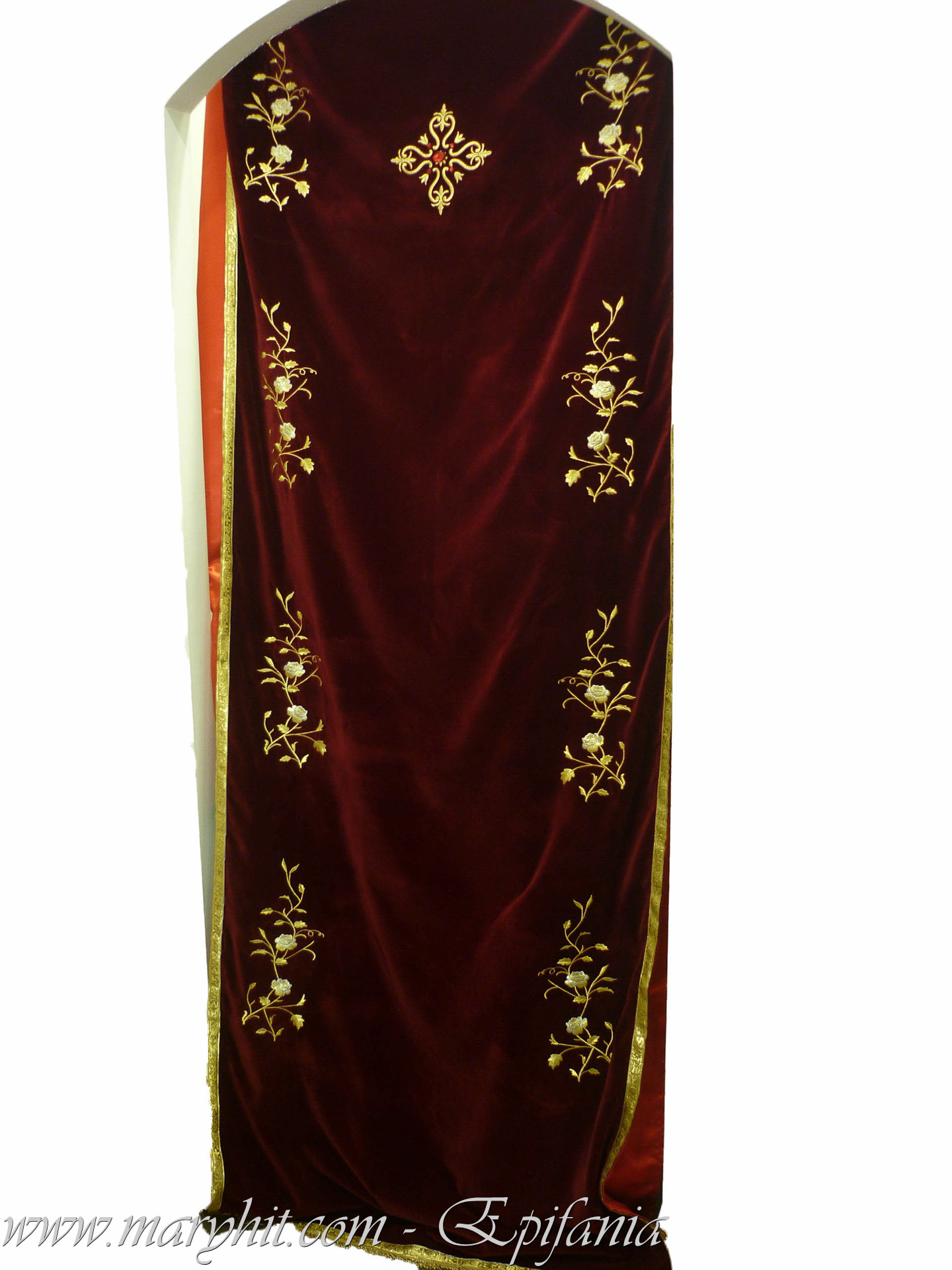 IB005 - Fata de masa pentru Sf Altar din catifea grena cu broderie fir auriu model trandafiri.