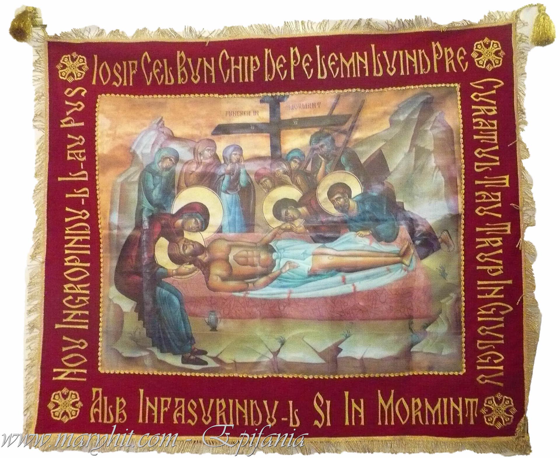 IB017 - Epitaf (Sf Aer) cu Icoana imprimata Adormirea Mantuitorului (rezistanta la intemperii). Margine din catifea rosie cu broderie scris brodat.