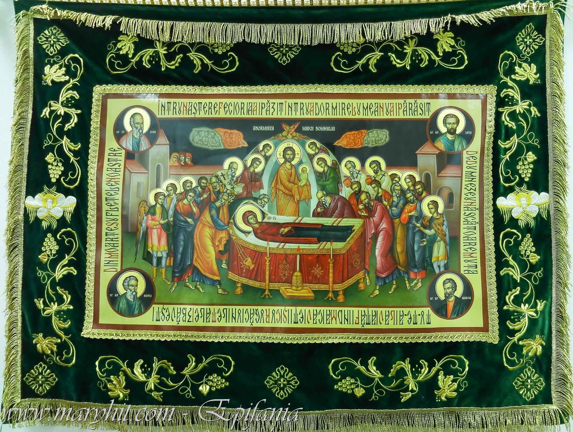 IB018 - Epitaf (Sf Aer) cu Icoana imprimata Adormirea Maicii Domnului (rezistenta la intemperii). Margine din catifea verde cu broderie model flori si struguri.