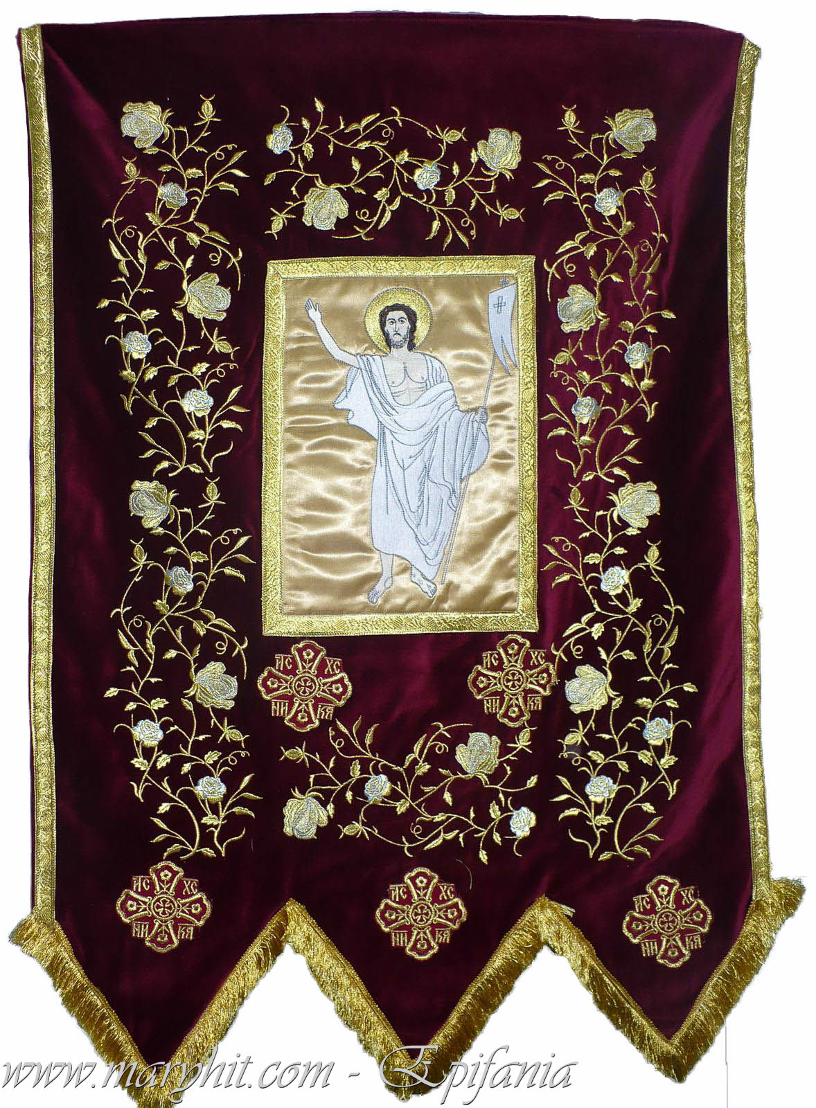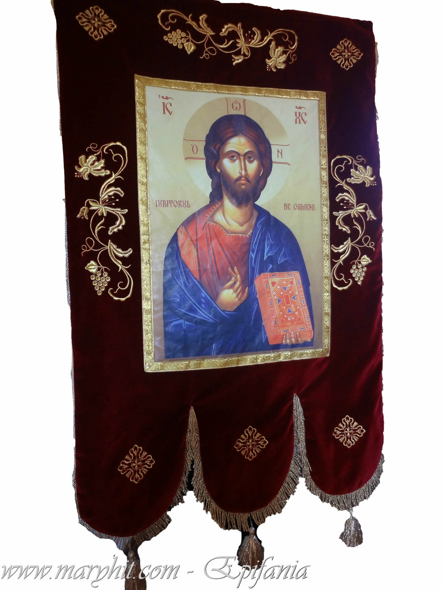 IB019 - Steag (Prapur) cu icoana Mantuitorului imprimata (rezistenta la intemperii) din catifea grena brodata cu model flori si struguri.