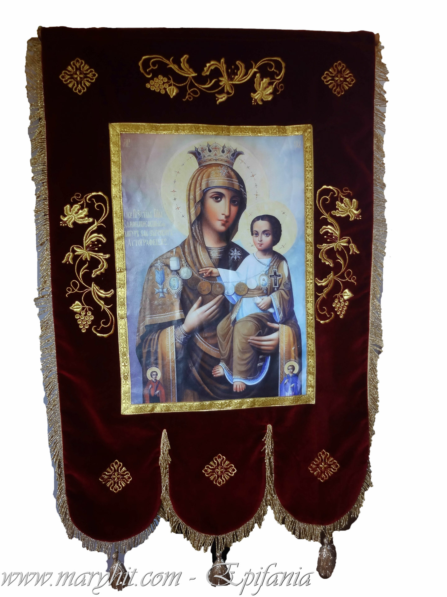 IB020 - Steag (Prapur) cu icoana Maicii Domnului imprimata (rezistenta la intemperii) din catifea grena brodata cu model flori si struguri.