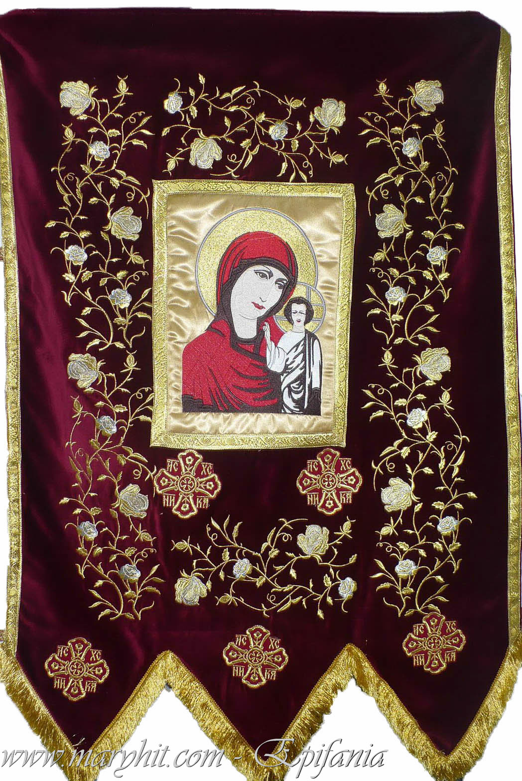 IB022 - Steag ( Prapur ) cu icoana Maicii Domnului brodata din catifea grena cu broderie model trandafiri.