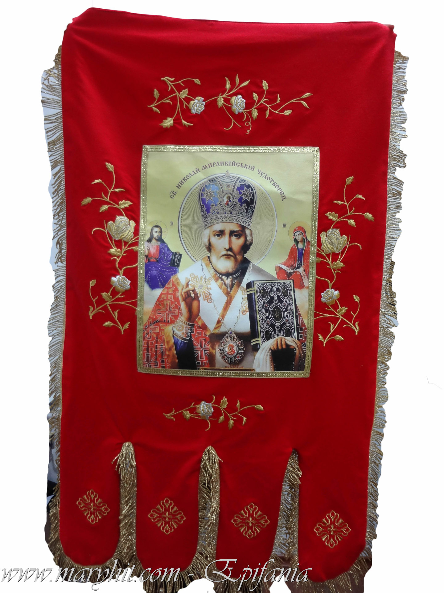 IB024 - Steag ( Prapur ) cu icoana Sf Nicolae imprimata si catifea rosie cu broderie model trandafiri.