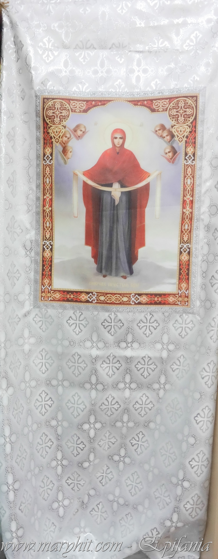 IB026 - Dvera ( perdea usi imparatesti ) din brocard alb cu icoana imprimata Acoperamantul Maicii Domnului.