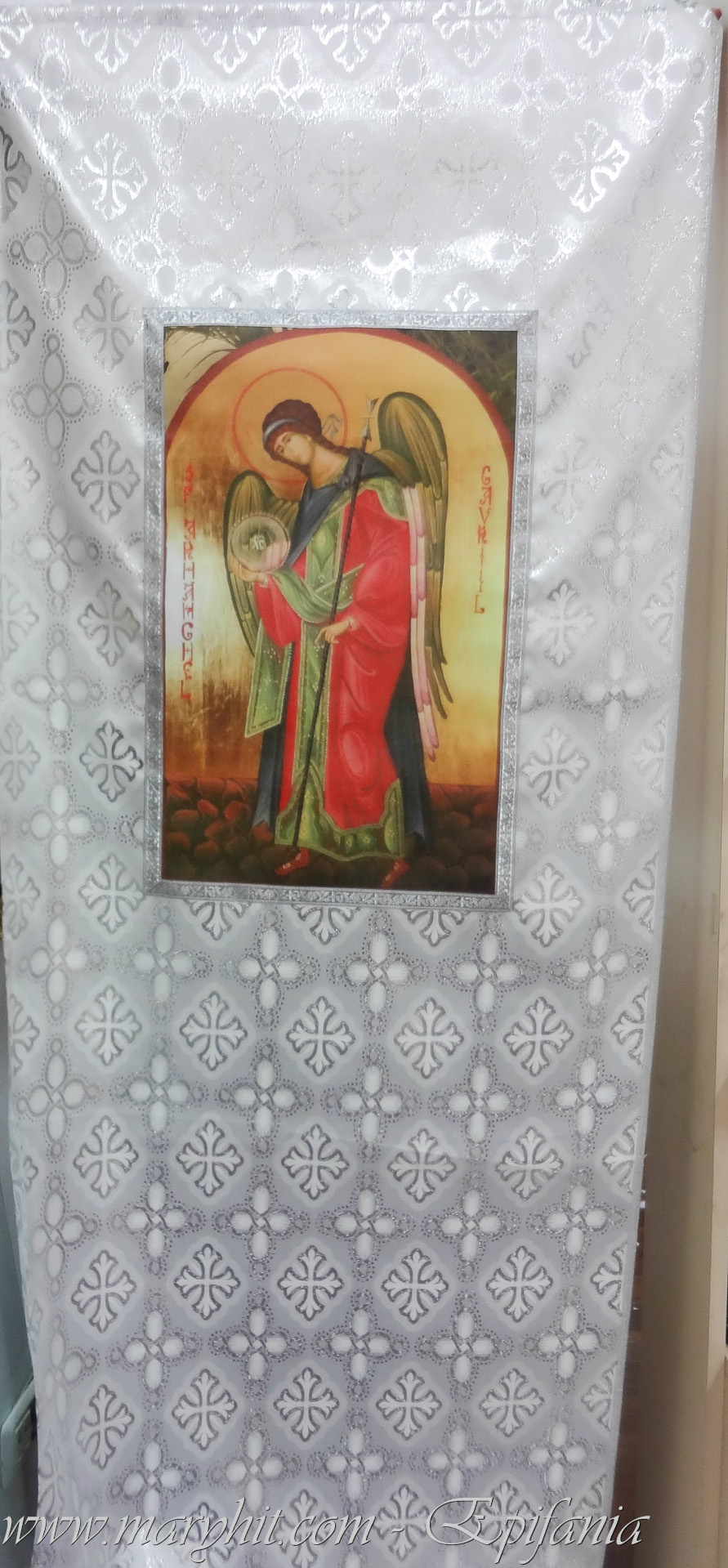 IB027 - dvera ( perdea usi imparatesti ) din brocard alb cu icoana imprimata Arhangehel Mihail.