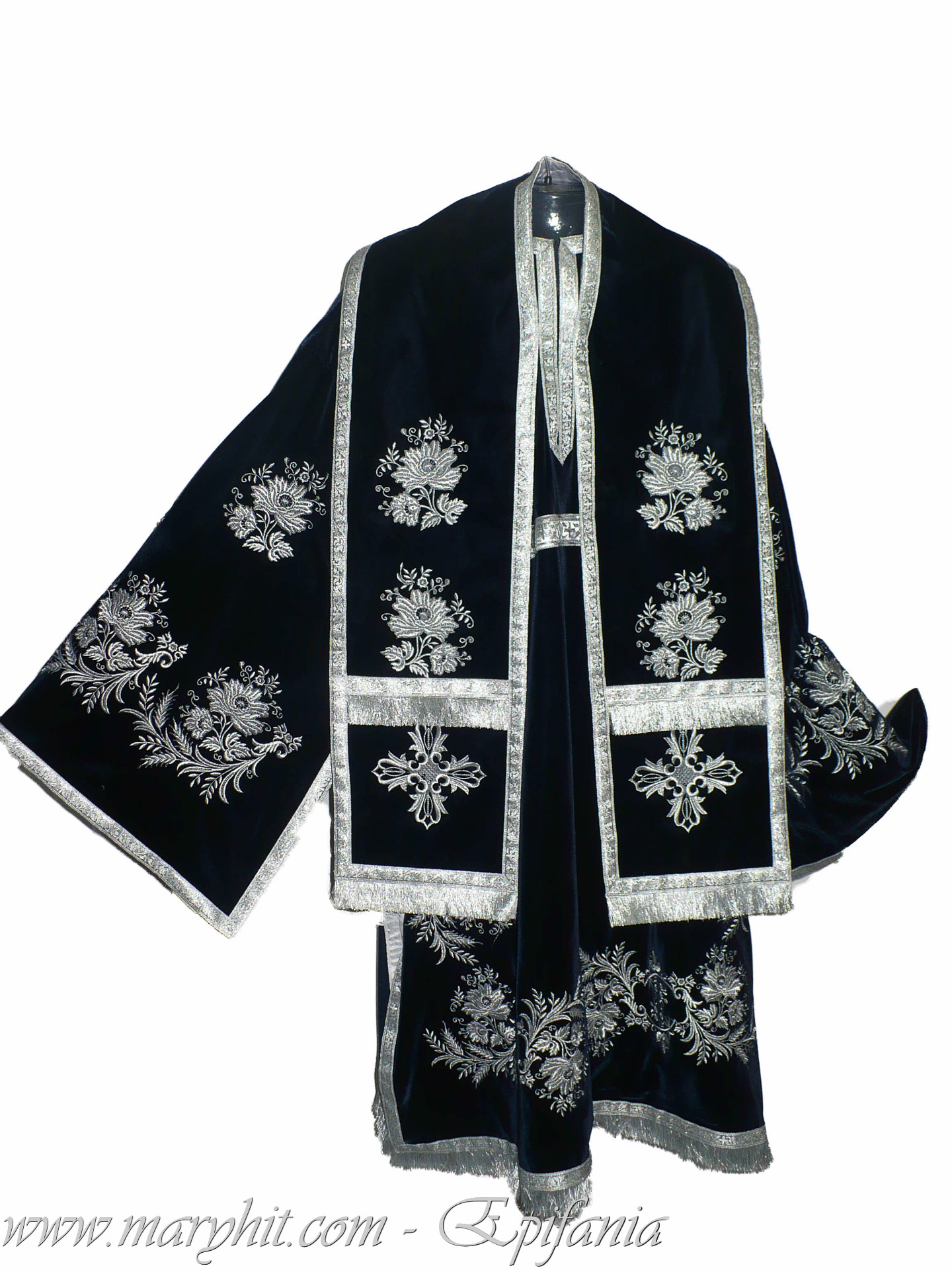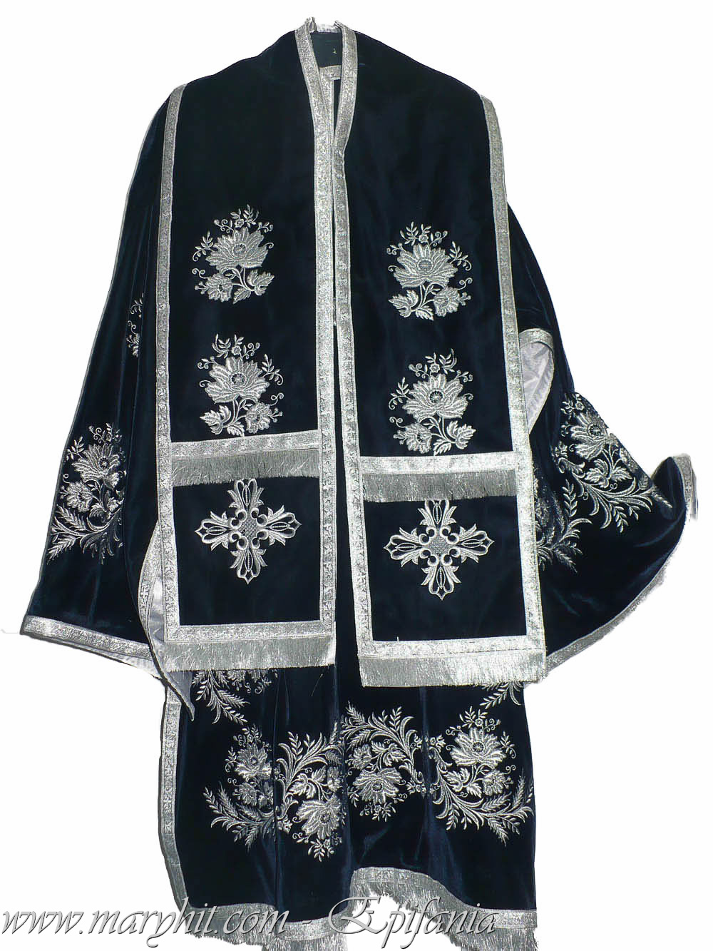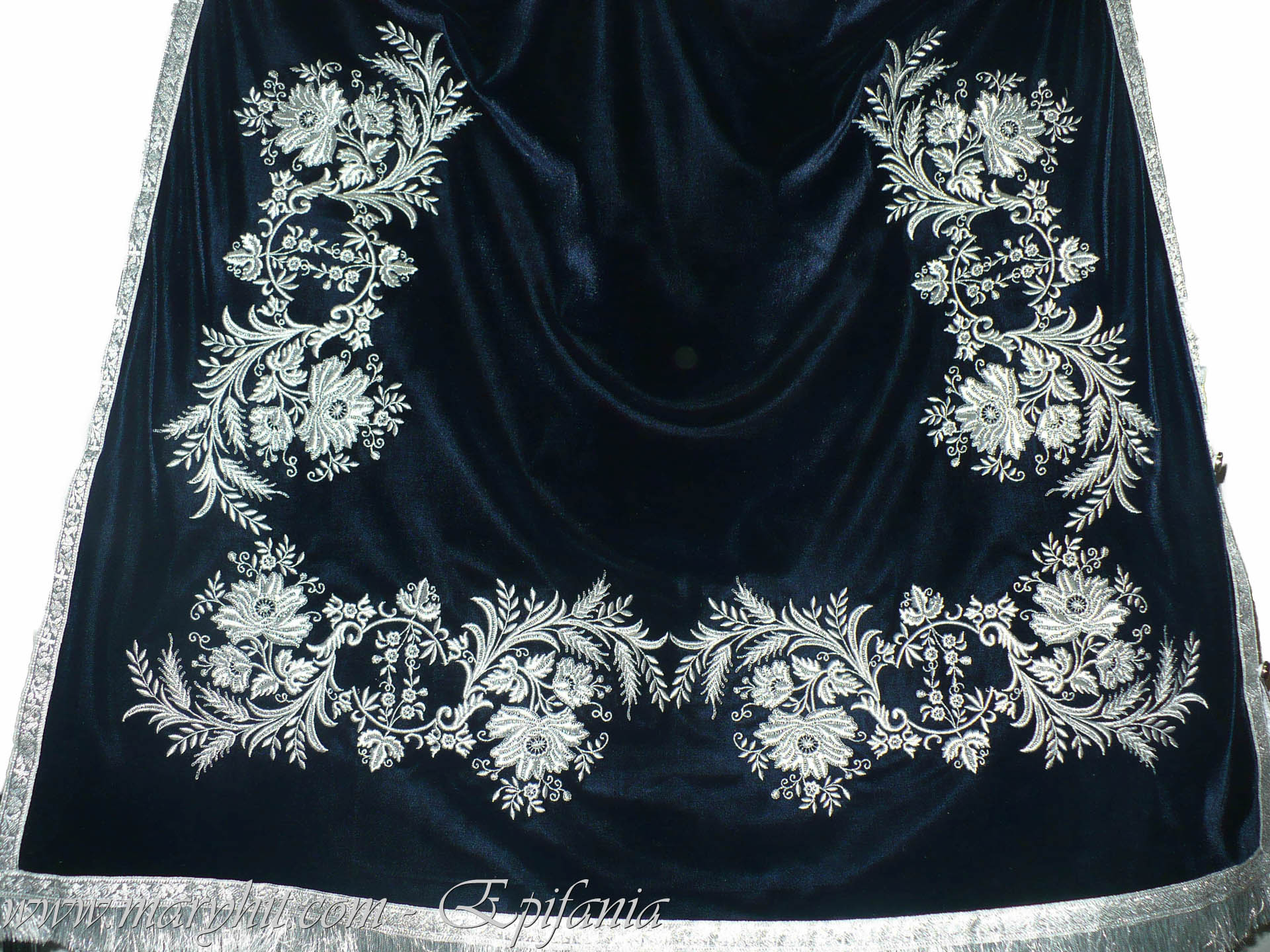 VA003 - Vesmant Arhieresc din catifea bleomaren cu broderie fir argintiu,model flori de gheata.